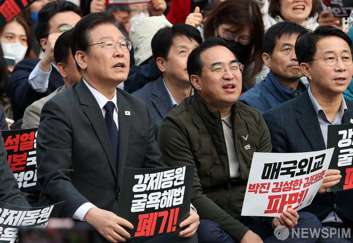 [서울=뉴스핌] 정일구 기자 = 이재명 더불어민주당 대표와 박홍근 원내대표가 25일 오후 서울 중구 서울광장 인근에서 열린 '대일 굴욕외교 규탄 4차 범국민대회'에서 구호를 외치고 있다. 2023.03.25 mironj19@newspim.com