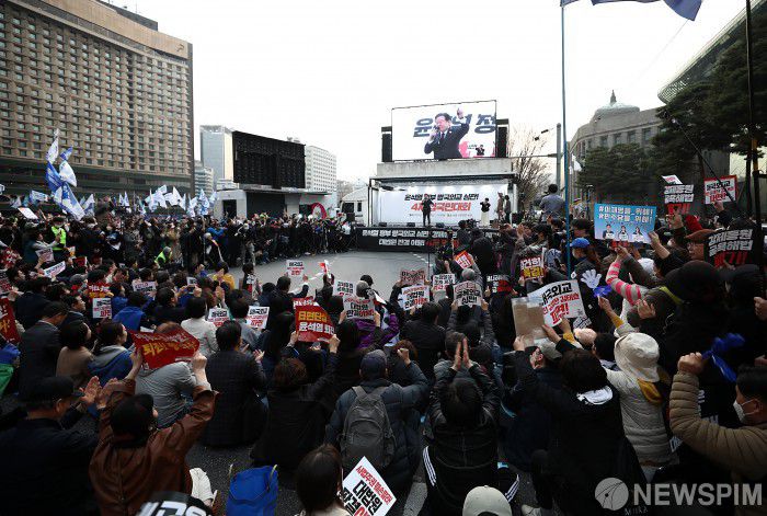 [서울=뉴스핌] 정일구 기자 = 이재명 더불어민주당 대표가 25일 오후 서울 중구 서울광장 인근에서 열린 '대일 굴욕외교 규탄 4차 범국민대회'에서 발언을 하고 있다. 2023.03.25 mironj19@newspim.com