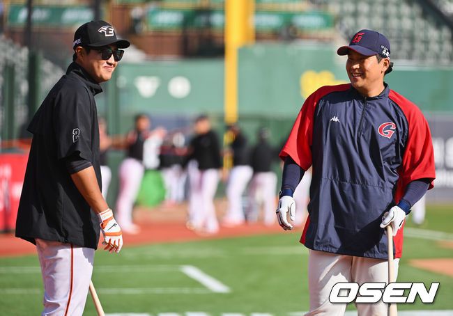 [OSEN=부산, 이석우 기자] LG 트윈스 동료였던 롯데 자이언츠 유강남과 한화 이글스 채은성이 경쟁자로 사직구장에서 만났다.
