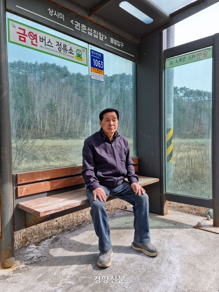 지난 3월 17일 만난 권춘섭씨(71)가 정류장을 돌아보며 말했다. 권상철씨가 작고한 뒤 이 정류장은 그의 아들 이름을 따 ‘권춘섭 집앞 정류장’이 됐다. 어린 시절을 이곳에서 보내다 강릉에 나가 살던 권춘섭씨는 40대에 이곳으로 다시 돌아왔다고 한다. 함께 살던 아내는 당뇨합병증으로 투병하다가 얼마 전 세상을 떠났다. 지금은 홀로 배추농사를 짓는다.