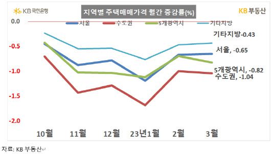 서울 아파트 매매가격도 1.17% 하락해 전월(-1.20%) 대비 하락폭이 줄어들었다. 특히 전국의 50개 고가의 대단지 아파트인 선도아파트 50지수 증감률은 전월대비 -0.45%로 하락하면서 2월(-0.84%) 대비 낙폭이 절반 가까운 수준으로 줄었다. 해당 지수는 지난해 11월 -3.14%에서 12월 -2.58%로 줄었고, 올 들어서도 석달 연속 낙폭이 줄어드는 모습이다.