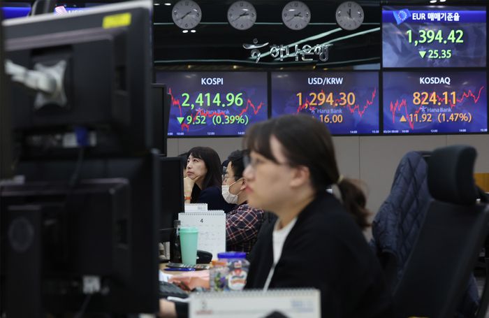 24일 오후 서울 중구 하나은행 딜링룸에서 직원들이 업무를 보고 있다. 연합뉴스 |
