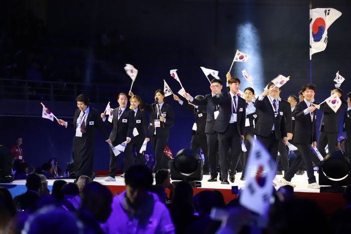 지난 22일(현지시간) 프랑스 메스 시의 아레나 메스 열린 제10회 국제장애인기능올림픽대회 개회식에서 한국 선수단이 태극기를 흔들며 입장하고 있다. 장애인고용공단 제공 |