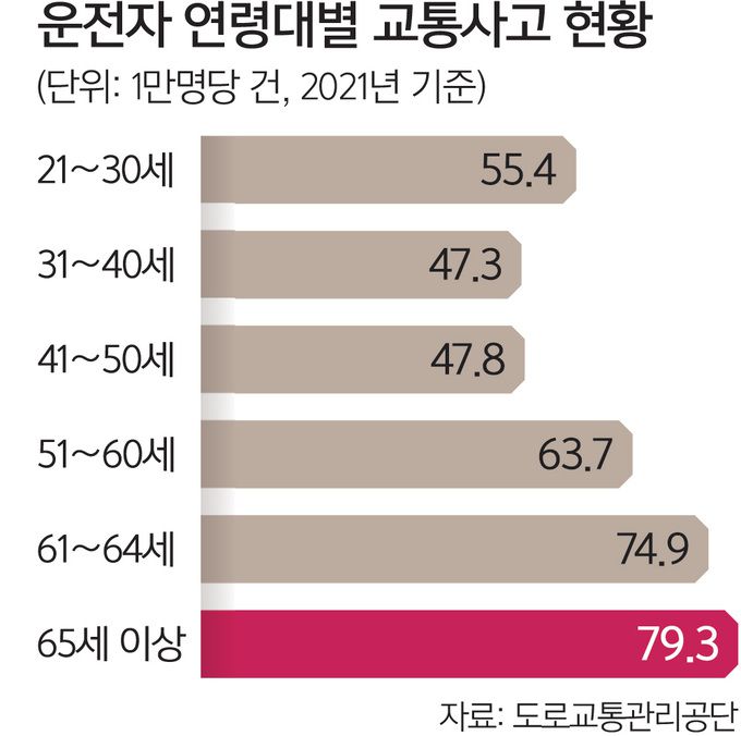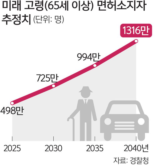 26일 경찰청에 따르면 국내 65세 이상 면허소지자는 빠르게 늘어나 2025년 498만명, 2030년 725만명, 2035년 994만명, 2040년 1316만명에 달할 것으로 추정된다. 고령 운전자 교통사고도 증가하는 추세다. 도로교통관리공단 자료를 보면 재작년 교통사고로 사망자를 가장 많이 낸 운전자 연령대는 65세 이상이었고, 전체 교통사고의 24.3%를 차지했다. 가장 최근에는 지난 20일 부산에서 79세 운전자 A씨가 행인 2명을 들이받고, 한 식당 내부로 돌진해 손님 5명을 다치게 한 사고가 있었다. A씨는 “액셀과 브레이크를 헷갈렸다”고 진술했다.