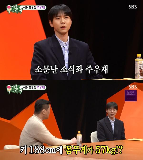 이날 MC 서장훈은 '주우재가 소식좌다. 많이 안 먹는다. 햄버거를 이틀 동안 먹는다"며 "키가 190㎝(188㎝) 가까이 되는데 몸무게가 57㎏라더라"고 말했다.