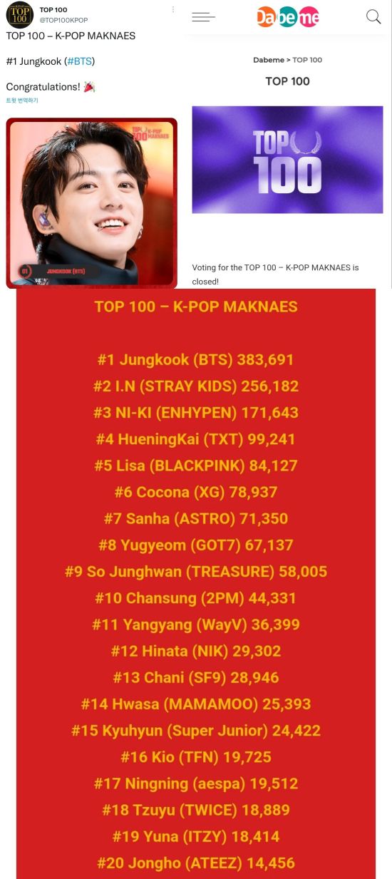 글로벌 엔터테인먼트 매체 '다베메'(Dabeme)가 'TOP 100 – K-POP MAKNAES'(톱 100 – K-팝 막내) 투표 결과를 발표했다.