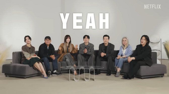 왼쪽부터 배우 차주영, 안길호 PD, 김히어라, 박성훈, 정성일, 김은숙 작가, 김건우.(사진=넷플릭스 코리아 유튜브 채널 캡처)
