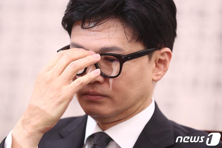 한동훈 법무부 장관이 27일 서울 여의도 국회에서 열린 제404회 국회(임시회) 법제사법위원회 제2차 전체회의에 출석해 안경을 고쳐 쓰고 있다. 2023.3.27/뉴스1 ⓒ News1 유승관 기자 |