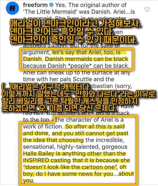 디즈니가 미스 캐스팅 논란에 직접 입을 열었다. 지난 2019년 7월 디즈니 산하 TV 채널인 프리폼(freeform)은 공식 SNS에서 ‘낫 마이 애리얼’ 해시태그가 배우를 배척하는 문구에 불과함을 지적했다. 프리폼은 “애리얼이 덴마크인이라고 가정해본다면 덴마크 인어는 흑인일 수 있다”라고 설명했다. 동화 ‘인어공주’를 쓴 안데르센 작가가 덴마크 출신인 것에 빗댄 비판이었다. 프리폼은 이어 “애리얼은 허구의 캐릭터에 불과하다, 탁월한 캐스팅을 인정하지 못하겠다면 당신이 문제다”라고 비꼬았다. ‘가엾고 불행한 영혼들에 보내는 공개편지’라는 설명까지 친절히 더했다.