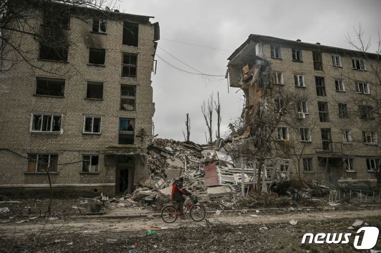 18일 (현지시간) 우크라이나 도네츠크 아우디우카에서 러시아 군의 포격을 받아 사라진 아파트가 보인다. ⓒ AFP=뉴스1 ⓒ News1 우동명 기자
