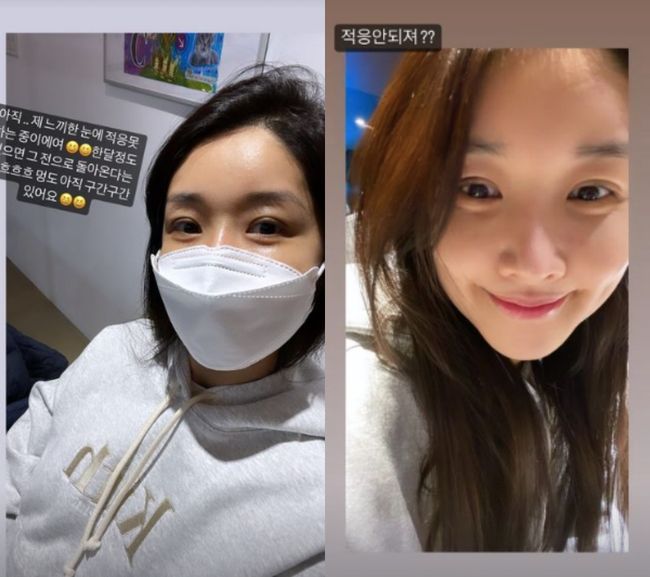 27일 김빈우는 “아직 제 느끼한 눈에 적응 못하는 중이에요. 한달 정도 있으면 그 전으로 돌아온다는데 흐흐흐 멍도 아직 구간구간 있다”라며 시술 후 부은 눈을 공개했다.