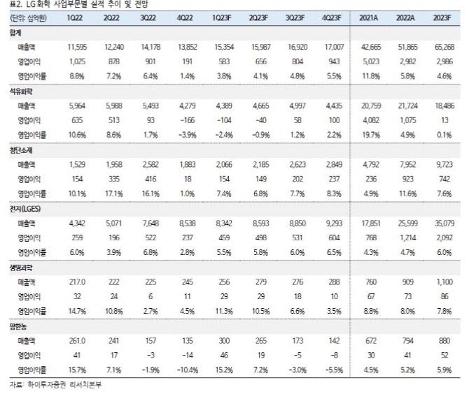 전유진 하이투자증권 연구원은 “올해 1분기 영업이익은 5828억원으로 컨센서스 6055억원에는 소폭 못 미칠 전망”이라며 “부문별로 석유화학에서 적자 규모가 축소됐고, 첨단소재는 전 분기 주요 고객사의 재고조정으로 감소했던 출하량이 정상화됨에 따라 매출 및 영업이익이 직전 분기 대비 대폭 늘어났다”고 설명했다.