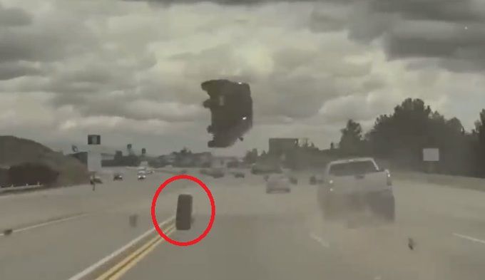 미국 고속도로에서 구르던 타이어(붉은 원)에 차체 하단이 걸려 사고를 당하는 차량(검은색). 사고를 유발한 타이어는 오른쪽 차로의 흰색 트럭에서 떨어져나온 것이다. KTLA 뉴스 영상 갈무리