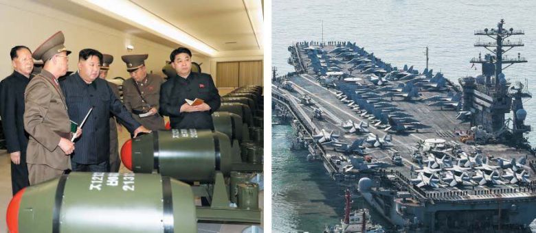 북한 김정은 국무위원장이 지난 27일 핵무기연구소에서 전술핵무기 관련 보고를 받고 있는 모습(왼쪽 사진)이 28일 조선중앙통신에 공개됐다. 김정은 앞에는 일련번호가 붙은 전술 핵탄두가 전시돼 있다. 전술 핵탄두 실물 사진이 공개된 것은 처음이다. 이런 가운데 미 해군 항공모함 니미츠함(오른쪽 사진)은 28일 부산항에 입항했다. 한미는 니미츠함 입항을 계기로 조만간 한·미·일 3국 해상훈련을 실시할 계획이다. /조선중앙통신 연합뉴스·김동환 기자 |
