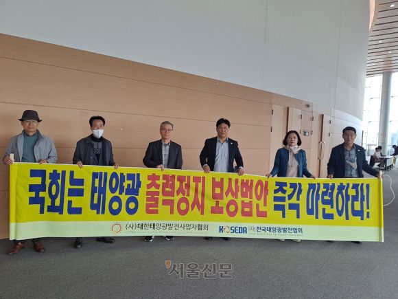 28일 한국태양광산업협회 곽영주 회장과 임원들이 설명회장 입구에서 발전 제어에 대한 보상 법안을 마련하라고 촉구하는 모습. 광주 서미애 기자
