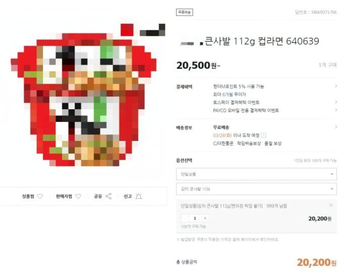 그가 자신이 구매한 컵라면의 온라인 사이트 판매 화면 사진을 함께 올렸는데, 사진에는 '큰사발 112g 컵라면'이라는 상품명과 2만500원이라는 가격이 적혀 있다.