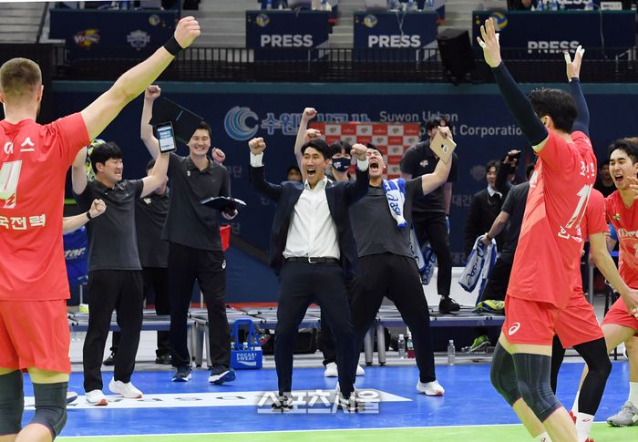 한국전력 권영민 감독(가운데)이 26일 수원체육관에서 열린 2022-2023 V리그 현대캐피탈과의 플레이오프 2차전에서 세트 스코어 3-2로 승리한 뒤 포효하고 있다. 2023. 3. 26. 수원 | 박진업기자 upandup@sportsseoul.com |