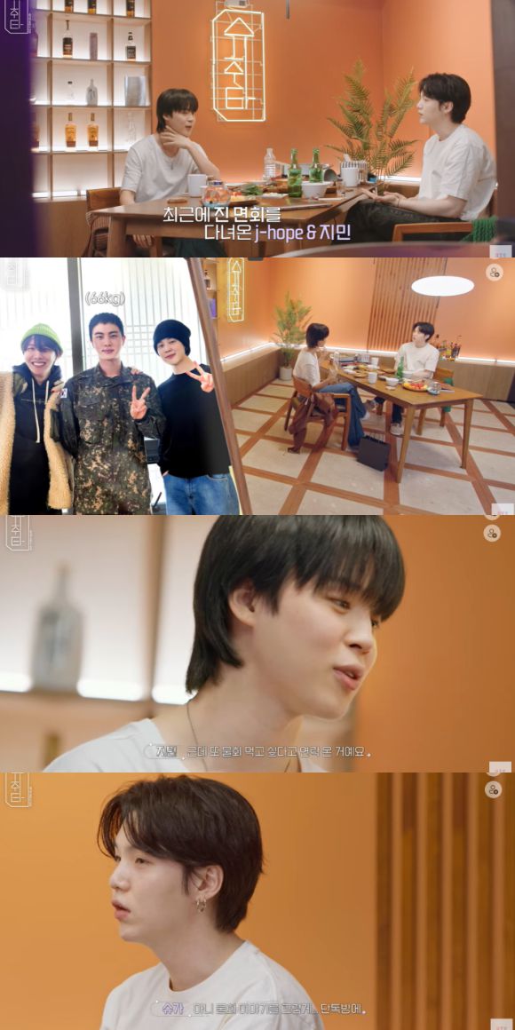 지민은 또 "같이 밥을 먹었는데, 전 짜장면을 먹고 진 형은 물회를 먹었다. 전 주에 면회간 의전팀과 먹었는데 또 먹고 싶다고 했다"고 전했다. 슈가는 "단톡 방에 물회 이야기 밖에 안하는 것 같다. 물회 못 먹어서 죽은 귀신이 붙었나"라고 말해 웃음을 안겼다.