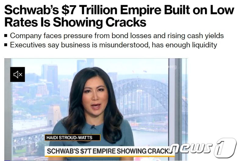 (서울=뉴스1) 박형기 기자 = 실리콘밸리은행(SVB) 파산으로 시작된 미국의 금융위기의 다음 희생양은 미국 최대의 증권사 찰스 슈왑이 될 가능성이 커지고 있다고 블룸버그통신이 28일(현지시간) 보도했다.