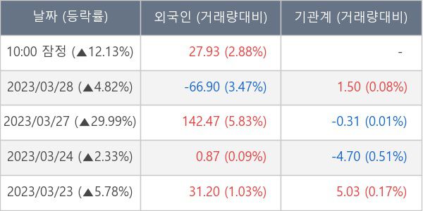 [서울=뉴스핌] 로보뉴스 = 29일 10시 15분 현재 포스코엠텍(009520)은 외국인이 27.93만 주 대량으로 순매수(잠정) 하면서 전일 대비 12.13% (현재가 21,450원) 상승하고 있다.