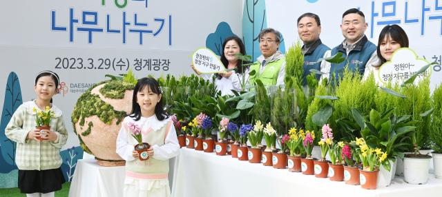 임정배(오른쪽에서 세번째) 대상㈜ 대표이사 남태헌(〃 네번째) 한국산림복지진흥원장 등이 29일 서울 종로구 청계광장에서 열린 '2023 청정원 희망의 나무 나누기' 행사에 참석해 미래의 주역인 어린이들에게 청정한 지구를 선물한다는 의미의 퍼포먼스를 하고 있다. 식목일을 앞두고 산림에 대한 소중함과 관심 제고를 위해 마련된 이날 행사에서 침엽수 및 유실수 묘목과 공기정화 식물 등 총 4000본이 시민들에게 무료로 전달됐다. 오승현 기자 2023.03.29