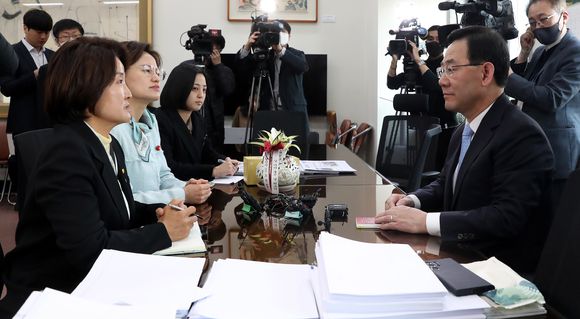 [아이뉴스24 박정민 기자] 정의당이 29일 국민의힘을 찾아 자당이 발의한 '대장동 50억 클럽 특검'(이하 50억 특검)을 국회 법제사법위원회(법사위)에서 심의해줄 것을 촉구했다. 국민의힘 측은 정의당의 요청에 자당 김도읍 의원이 위원장인 법사위에 심사를 요청하겠다고 답했다. 민주당은 쌍특검(50억+김건희 특검) 추진과 관련된 정의당의 단독행동에 불만을 표시했다.