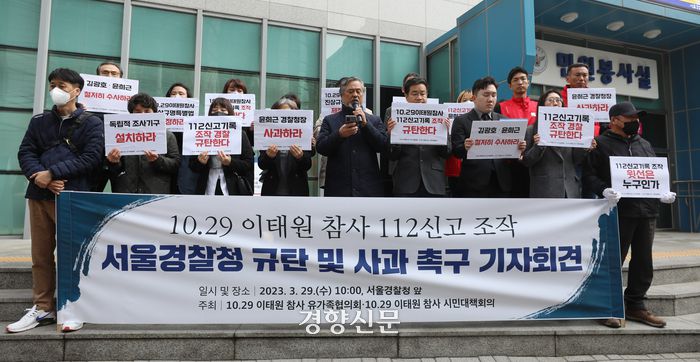 10·29 이태원참사유가족협의회와 시민대책회의는 29일 오전 10시 서울경찰청 앞에서 기자회견을 열고 “경찰이 112 신고기록 조작을 통해 책임을 덮으려고 했던 정황이 드러났다”며 이같이 밝혔다.