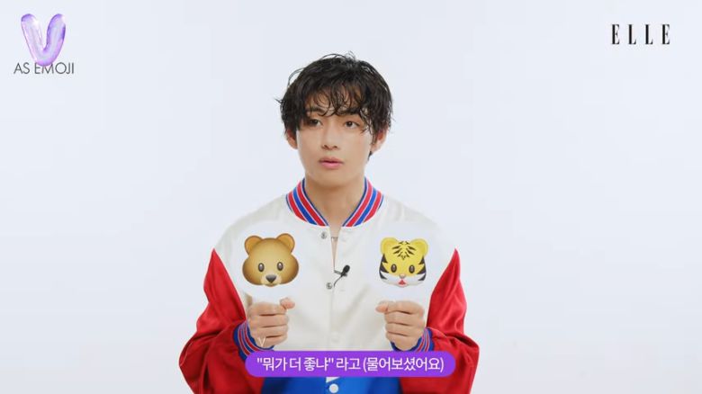 이어 ‘뷔VS김태형’이라는 질문에는 각각 호랑이, 곰 이모지를 골라 눈길을 끌었다. 뷔는 “뷔에서는 무대를 할 때 강해야 한다는, 더 멋있어보이고 싶은 모습을 담아낸 것 같다. 괜히 인상 찌푸리고 괜히 더 멋있어보이려고 하는 모습을 지니고 있다”고 설명했다.