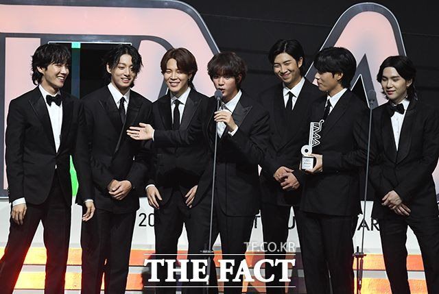 빅히트 뮤직이 방탄소년단에 대한 악성 게시물과 관련해 다수의 고소장을 접수했다고 알렸다. 사진은 '2022 더팩트 뮤직 어워즈'에서 수상하는 모습. /더팩트 DB |