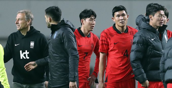 대한민국 손흥민과 김민재가 28일 오후 서울 마포구 서울월드컵경기장에서 열린 하나은행 초청 축구 국가대표 평가전 대한민국과 우루과이의 경기에서 2대1로 패한 뒤 아쉬워하고 있다. 뉴시스 |