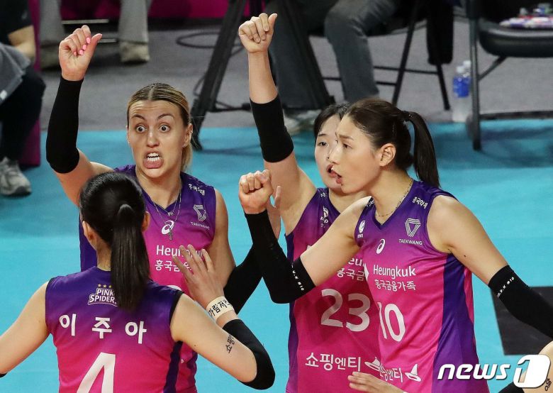 (인천=뉴스1) 박세연 기자 = 29일 오후 인천시 부평구 삼산월드체육관에서 열린 V리그 여자프로배구 챔피언 결정전 흥국생명과 한국도로공사 1차전 경기에서 흥국생명 김연경과 옐레나가 득점 성공 후 환호하고 있다. 이번경기에서 흥국생명은 세트스코어 3대1로 승리했다. 2023.3.29/뉴스1