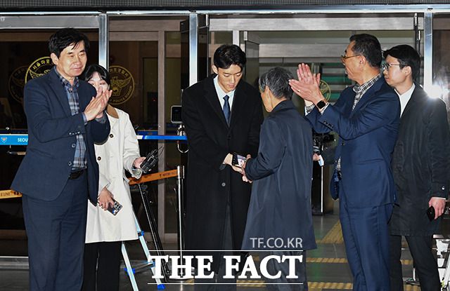 전두환 전 대통령의 손자 전우원이 29일 오후 서울 마포구 마포경찰서에서 마약 투약 혐의로 경찰 조사를 받은 뒤 건물을 나서며 5.18 관련 시민단체 회원들에게 박수를 받고 있다.