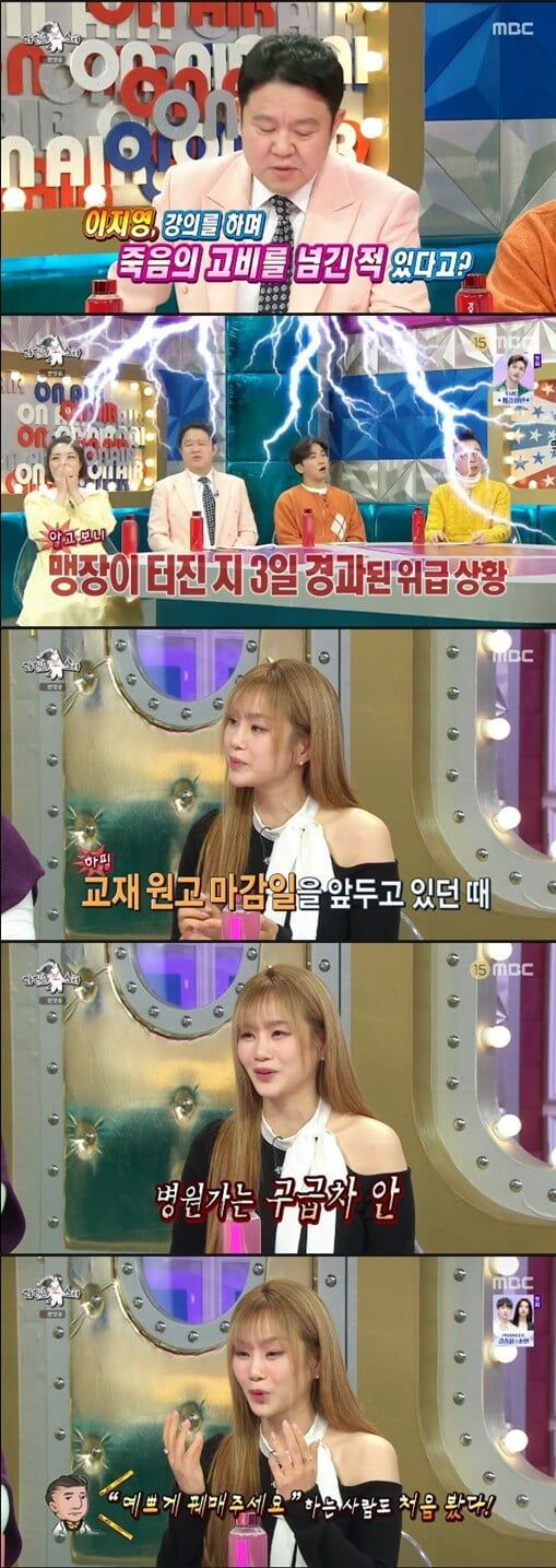 이날 MC 김구라는 "강의를 하다가 죽음의 고비를 넘긴적이 있다고?"라고 묻자 이지영은 "교재 마감을 앞두고 있는데 배가 많이 아팠다"라며 "진통제를 먹으면서 책을 썼는데 30분 마다 아프더라. 나중에 정신을 잃고 정신을 차렸더니 응급실이였다"라고 밝혔다.