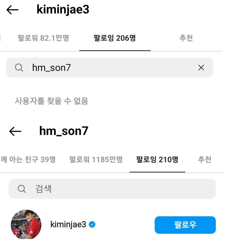 한국 축구대표팀의 김민재(27·나폴리)가 대표팀 은퇴를 시사하는 듯한 발언으로 파장을 일으킨 가운데, 대표팀 주장 손흥민(30·토트넘)이 “국대 유니폼을 입는 것은 항상 영광”이라는 내용의 글을 올렸다. 이후 김민재가 손흥민의 인스타그램 계정 팔로우를 끊으며 축구팬들 사이에선 ‘두 사람 간 마찰이 생긴 것 아니냐’는 추측이 나오고 있다. 다만 현재 두 사람은 서로 다시 ‘맞팔로우’를 한 상태다.