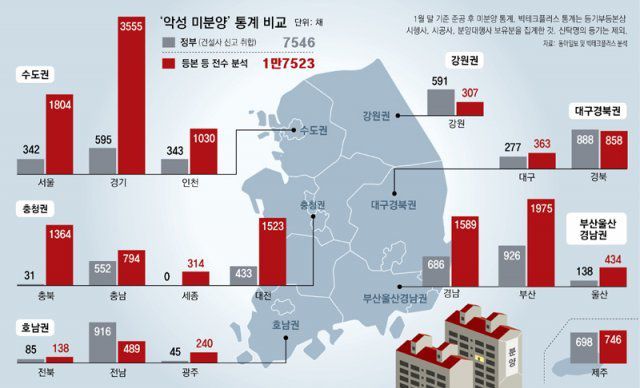 29일 동아일보와 프롭테크 기업인 빅테크플러스가 2017년 이후 준공된 전국 3763개 단지 161만3344채 규모의 공동주택 등기부등본의 빅데이터 분석을 실시한 결과 올해 1월 말 기준 준공 후 미분양 물량은 1만7523채로 집계됐다. 이는 시행사와 시공사 등이 준공 후에도 보유 중인 물량으로 신탁사 물량(4096건)은 제외했다. 국토교통부의 1월 말 기준 전국 준공 후 미분양 아파트 통계(7546채)와 비교하면 약 2.3배 규모로, 신탁사 물량까지 합하면 더 늘어날 것으로 보인다.