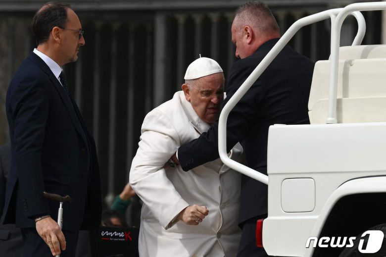 29일 프란치스코 교황이 병원으로 가기 전 도움을 받으며 차에 오르는 모습. ⓒ AFP=뉴스1 |