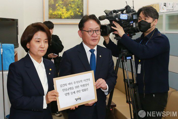 이은주 정의당 의원은 "실제 50억 클럽에 연루된 몇몇 분들이 검찰과 관계가 있는 사람들이기 때문에 더 이상 믿을 수 없다. 가장 빠른 길은 국회법에 따른 절차대로 진행하는 것"이라며 "(김 여사 특검법 관련해) 발의를 지난 24일에 했기 때문에 안건 상정을 위한 숙려 기간 때문에 4월 중순은 돼야 한다"고 말했다.