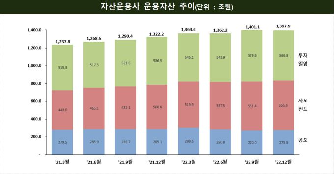 30일 금융감독원이 발표한 '2022년 자산운용회사 영업실적(잠정)'에 따르면 지난해 12월 말 기준 자산운용사 운용자산은 1397조 9000억원으로 집계됐다. 이는 전년 동기 대비(1322조2000억원) 대비 5.7%(75조7000억원) 증가한 수치다.