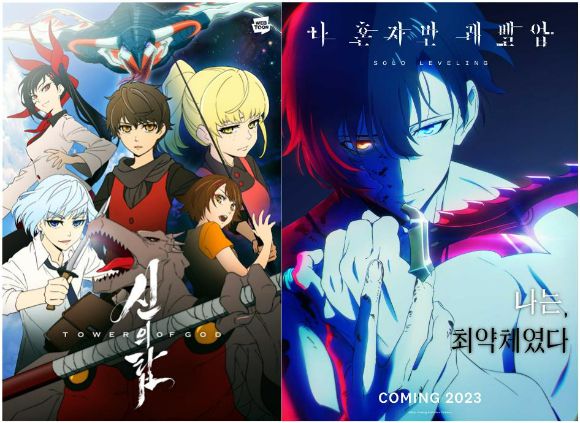 애니메이션으로 제작된 네이버웹툰 '신의탑'(왼쪽)과 카카오엔터테인먼트 '나 혼자만 레벨업' [사진=네이버·카카오] |