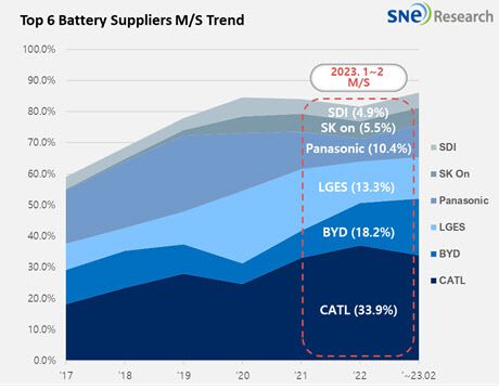 지난 1~2월 가장 많이 쓰인 전기차용 배터리는 중국 CATL 배터리였다. CATL은 1~2월 배터리 사용량이 25.5GWh로 전년 동기 대비 34% 늘며 점유율 33.9%를 기록했다. 2위 중국 BYD는 1~2월 배터리 사용량이 13.7GWh로 전년 동기 대비 122.6% 증가했다. BYD 점유율은 지난해 1~2월 11.3%에서 올해 1~2월 18.2%로 뛰어올랐다.