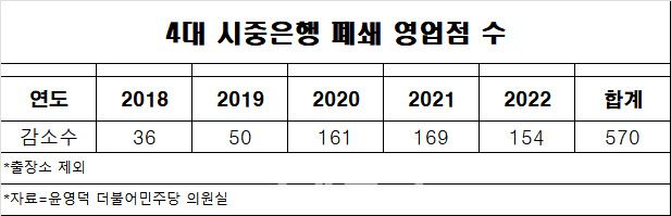 더군다나 최근 은행들이 비용절감을 이유로 영업점 수까지 빠르게 줄이고 있어, 소비자들의 불안감은 더 커지고 있다. 국회 정무위원회 소속 윤영덕 더불어민주당 의원실에 따르면 4대 시중은행(KB국민·신한·하나·우리)은 최근 5년간 총 570여곳의 영업점을 폐쇄한 것으로 집계됐다. 연도별로 보면 출장소를 제외하고 2018년 36곳이 줄었고, 2019년 50곳, 2020년 161곳, 2021년 169곳이 줄었다. 지난해에는 154곳의 영업점이 폐쇄됐다. 은행들은 온라인 영업 확대로 인한 대면영업 수요 감소로, 임대료·인건비 등을 줄이고자 영업점을 없애고 있는 것이다.
