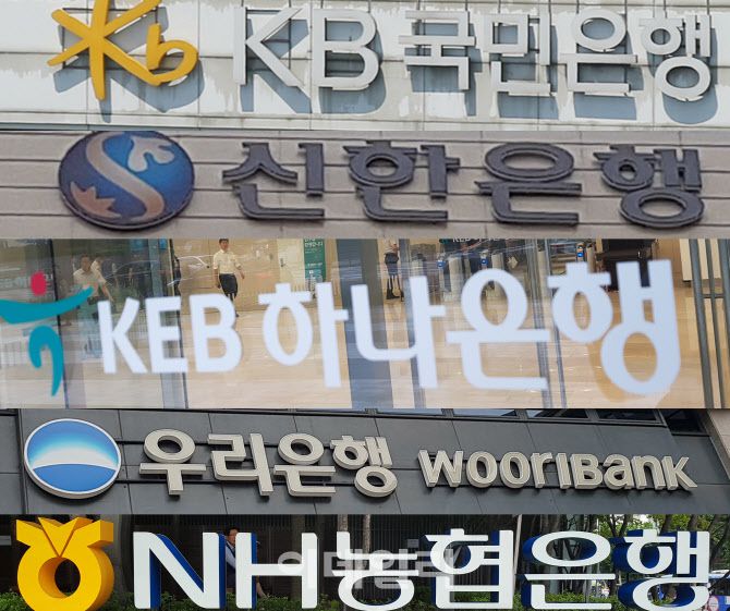 5대 시중은행 본점의 로고, 위에서부터 국민은행, 신한은행, KEB하나은행, 우리은행, 농협은행 [촬영 이세원] |