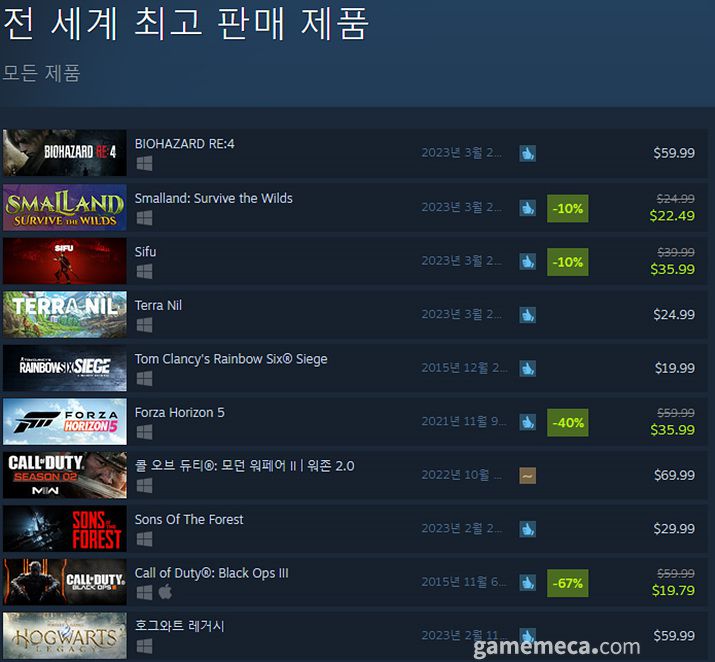 그 외에는 전일 1위까지 올랐던 더 라스트 오브 어스 파트 1이 혹평과 함께 순위권 밖으로 내려갔고, 밸런스 패치를 진행한 레인보우 식스 시즈가 5위에 올랐다. 시푸는 3위, 포르자 호라이즌 5는 6위로 상승했다.