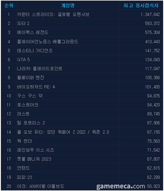▲ 3월 30일 오후 12시 기준 일 최고 동시접속자 TOP20 (자료출처: 스팀) |
