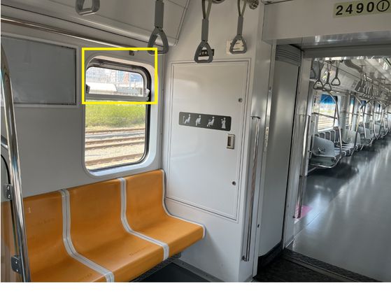 30일 서울교통공사는 지난 25일 새벽 0시50분 서울 2호선 290 편성 4호차 노약자 자리의 창문이 사라졌다고 밝혔다. 사진은 사라진 노약자석 위 창문 부분. 〈사진=서울교통공사 제공〉 |