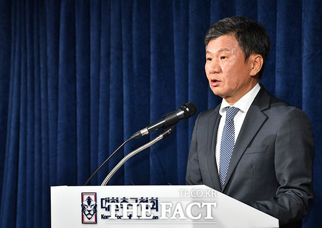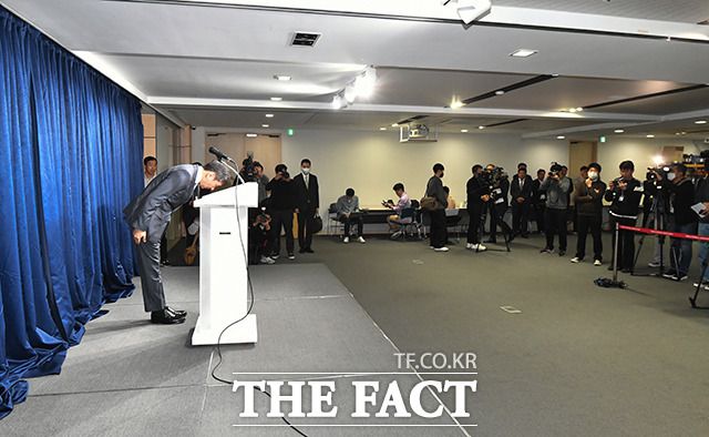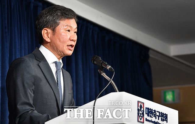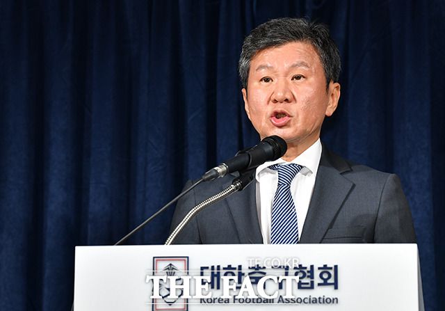 [더팩트ㅣ박헌우 기자] 정몽규 대한축구협회 회장이 31일 오후 서울 종로구 대한축구협회 축구회관에서 열린 임시이사회를 마치고 입장문을 발표하고 있다.
