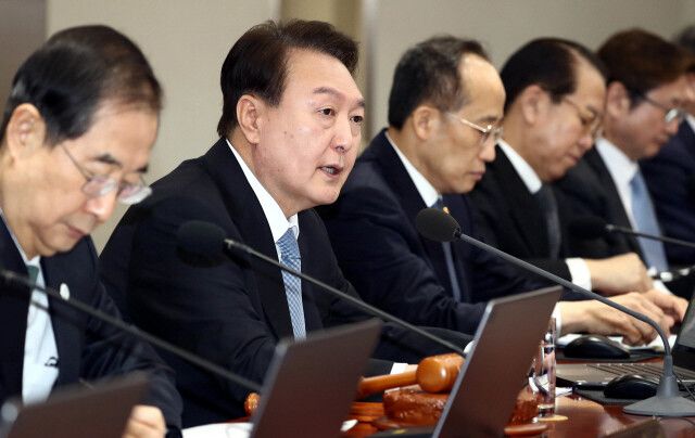윤석열 대통령이 21일 오전 서울 용산 대통령실 국무회의실에서 열린 제8회 국무회의에서 머리발언을 하고 있다. 윤운식 기자 yws@hani.co.kr