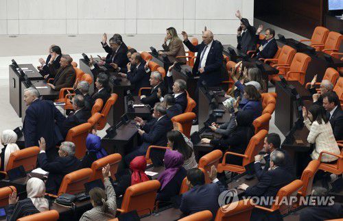(AP=연합뉴스) 30일(현지시간) 튀르키예 의회 의원들이 핀란드의 북대서양조약기구(NATO·나토) 가입 비준안에 대해 표결을 진행하고 있다. 2023.3.30 [재판매 및 DB 금지]