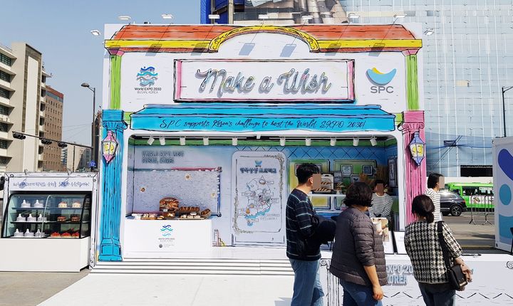 SPC그룹은 핸드드로잉 일러스트레이션으로 꾸민 '소원상점'을 콘셉트로 삼아 부스를 설치했다. 부스에선 SPC의 여러 브랜드를 활용해 부산엑스포 유치를 기원하는 다채로운 이벤트를 진행한다.