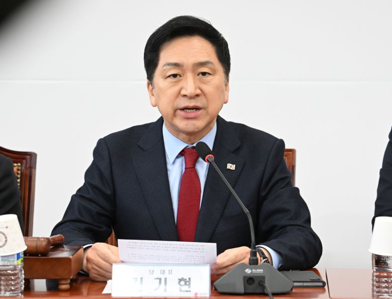 김기현 국민의힘 당대표가 27일 서울 영등포구 여의도 국회의사당 본청에서 열린 국민의힘 최고위원회의에 참석해 발언하고 있다. 임세준 기자 |